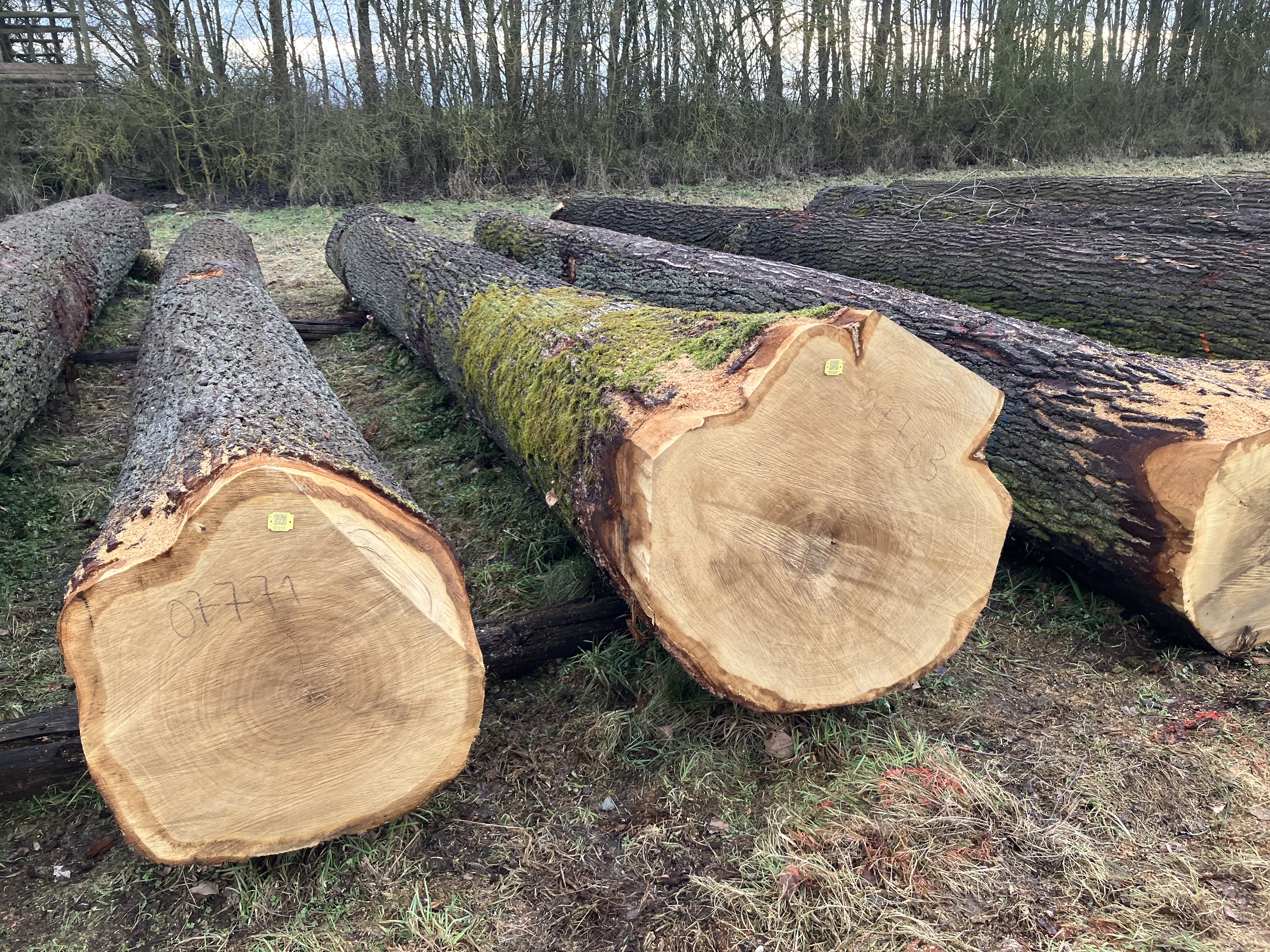 Bild 1: Rechts im Bild der Spitzenstamm (Los Nr. 1110) aus dem Stadtwald Bad Zwesten mit 2,7 Festmetern bei einer Länge von 6,9 Metern und 71 cm Durchmesser ohne Rinde.