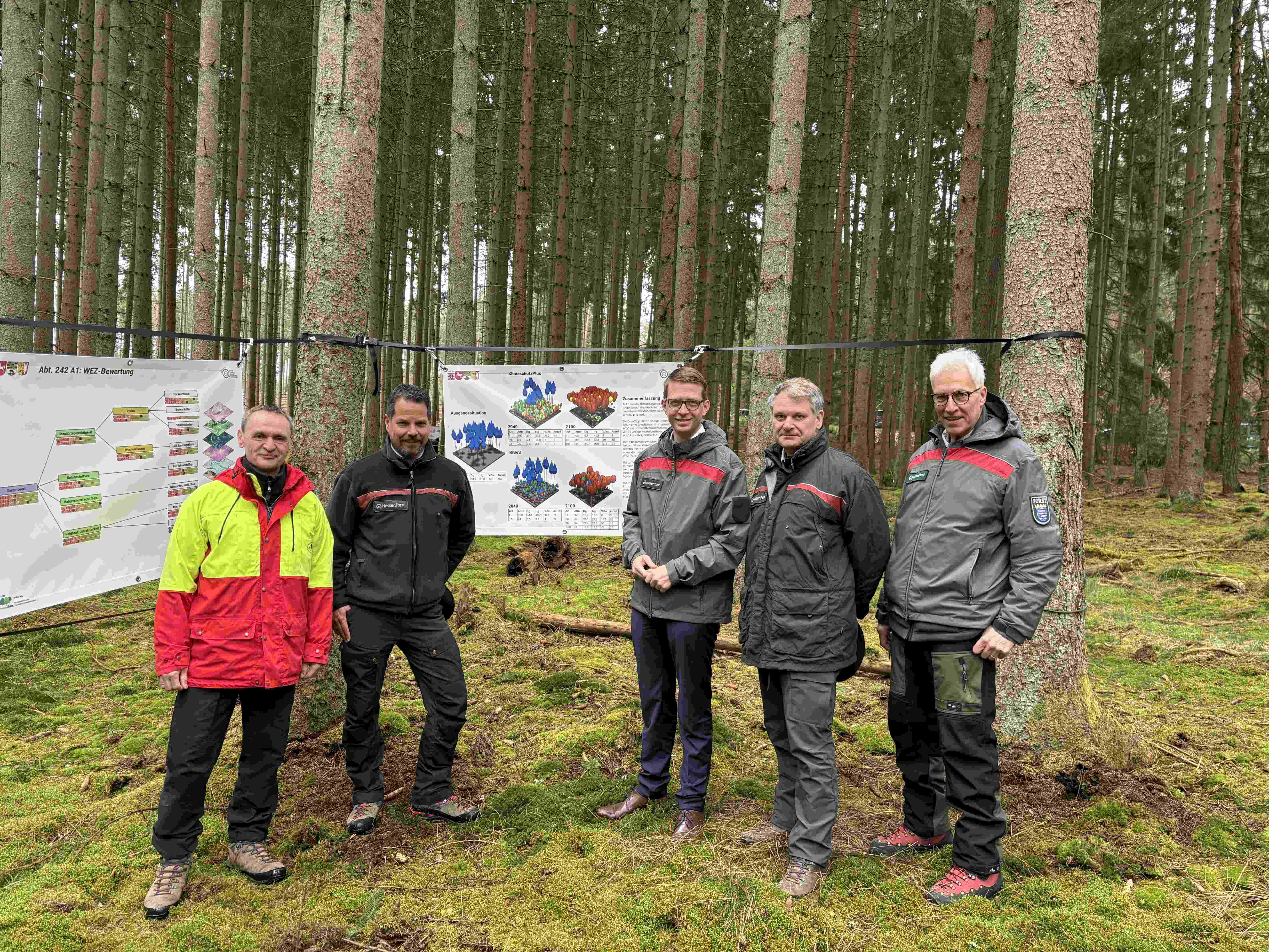 Bild 1: Staatssekretär Michael Ruhl (Mitte), Dr. Ralf-Volker Nagel (links, NW-FVA), Dr. Bernhard v. Finckenstein (2. v. rechts, Leiter HessenForst), Dr. Lars Wagner (2. v. links, Leiter Forstamt Burgwald) und Stefan Nowack (rechts, Leiter Abt. "Waldentwicklung und Umwelt", HessenForst).